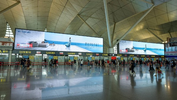 出发大厅LED巨幕:位于值机区域,是旅客进入机场后看到的第一块大型屏幕,视觉冲击力强,适合品牌形象“震撼登场”。