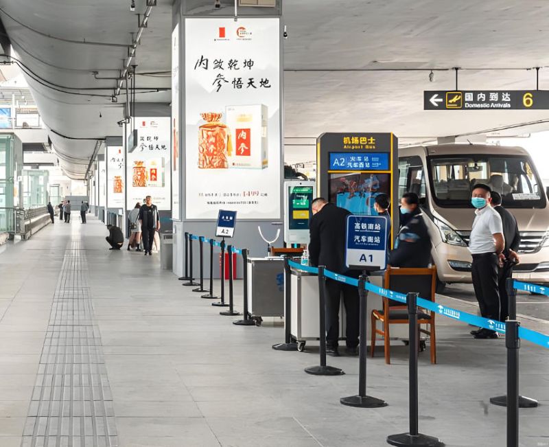 位于T2航站楼到达外车道区域,是旅客从航站楼出口前往停车场、接驳区的必经动线。这一场景下,旅客处于到达后短暂停留、选择交通方式”的状态,注意力相对集中,广告可实现100%到达旅客覆盖,且停留时间长于其他区域,强制观看效果显著