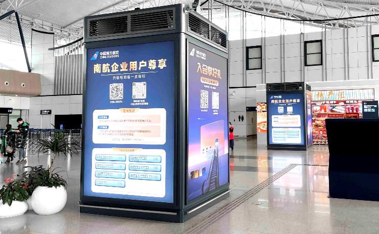 值机大厅内设置的多组立柱式灯箱,采用360°环绕设计,单点位即形成多面视觉覆盖,有效提升品牌信息的重复曝光率灯箱画面高清、亮度均匀,在环境光复杂的机场空间中依然保持出色的可视性与质感表现,强化高端品牌形象传递,旅客在排队、候检或查看航班信息时,视线会不自觉聚焦于周边灯箱,实现低压迫感下的深度触达