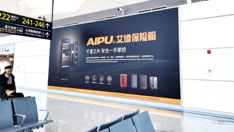 国内出发通廊候机区是连接安检区域与各登机口的核心枢纽通道,也是旅客候机流程中的关键过渡空间灯箱以纵深空间连续传播为核心设计理念,依托通廊的线性流动特性,构建起梯次视觉矩阵,让灯箱成为旅客步行移动中自然延续的视觉焦点,与普通候机区灯箱形成点 — 线互补的传播格局