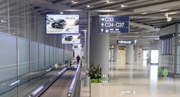 步道上方悬挂的LED刷屏机通常采用阵列式布局,形成了一张覆盖整条动线的视觉天网,当旅客拖着行李在步道上行进时,悬挂于头顶或侧上方的屏幕构成了视野中无法回避的视觉焦点,在核心动线上的视觉锚定,确保了品牌信息在旅客行程的关键节点,获得最高频次的有效触达